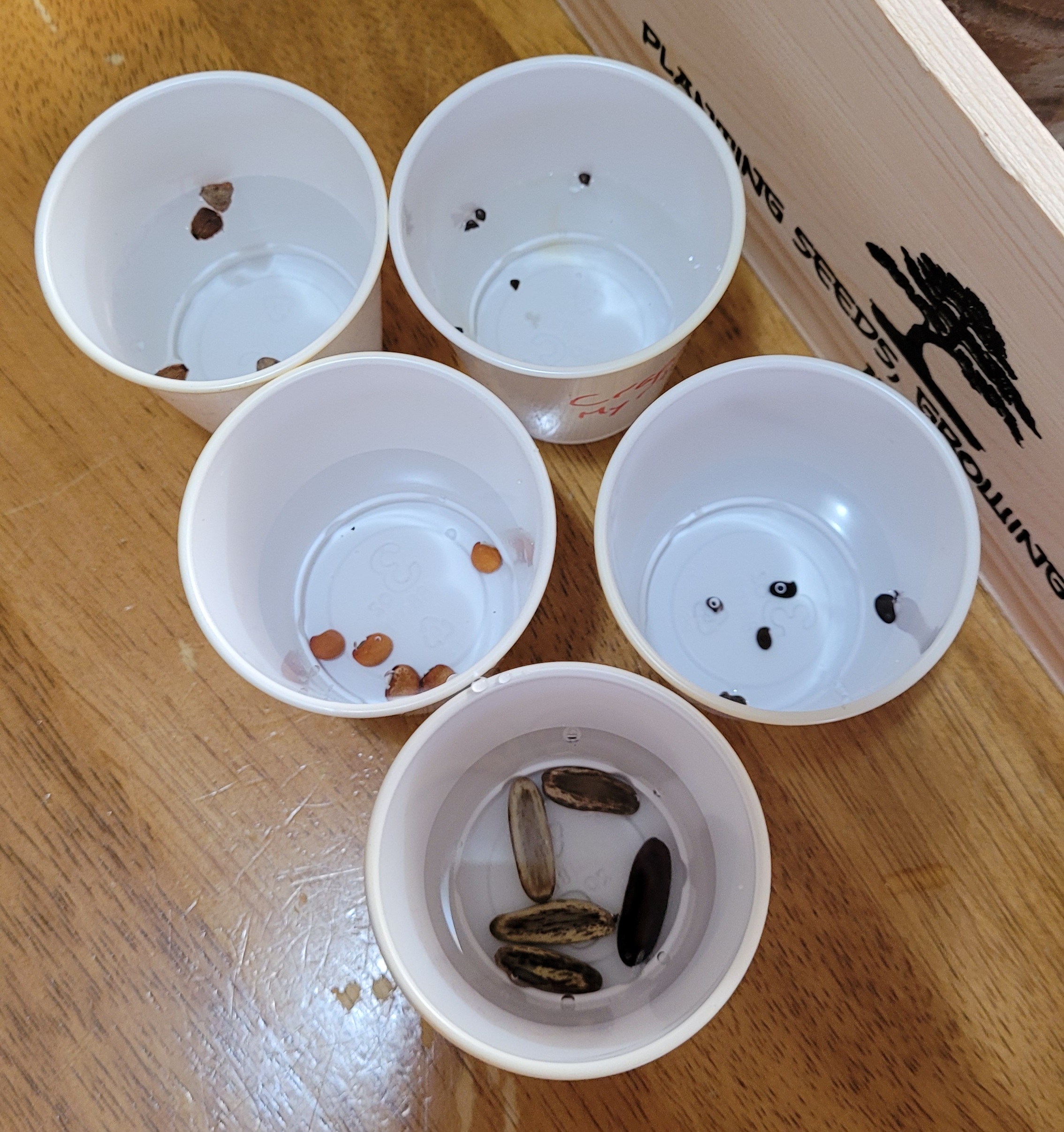 The first step is soaking the seeds. I wrote the names of the trees on these little cups and put 5 seeds in each like the instructions said. The kit came with lots of extra seeds for 4 of the 5 trees, so I can try again if I need to. The Delonix Regia only had 5 seeds, but they’re huge compared to the others. There’s also an extra packet of seeds that has more seeds in it, in case these fail, but I haven’t opened it yet to see what’s in it.