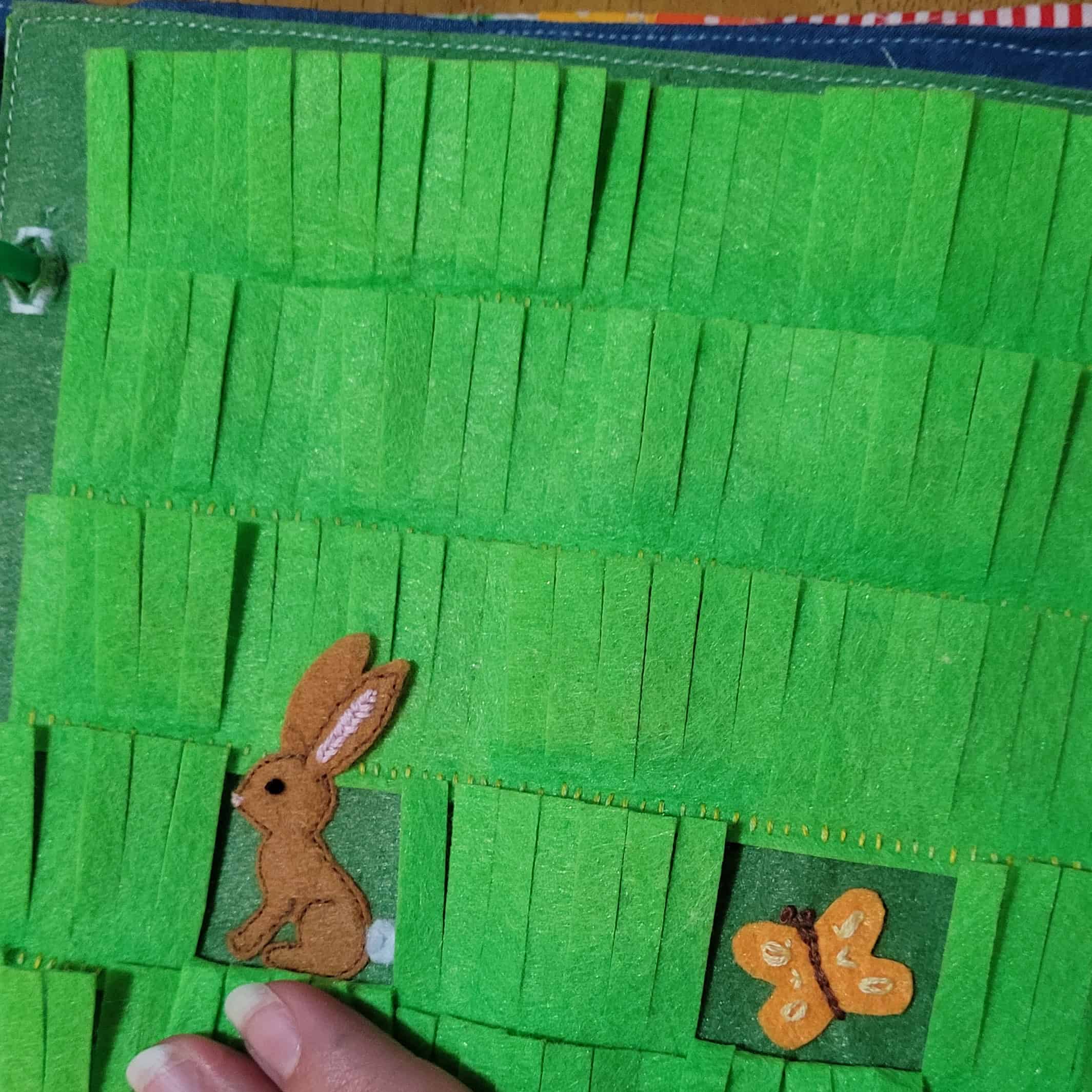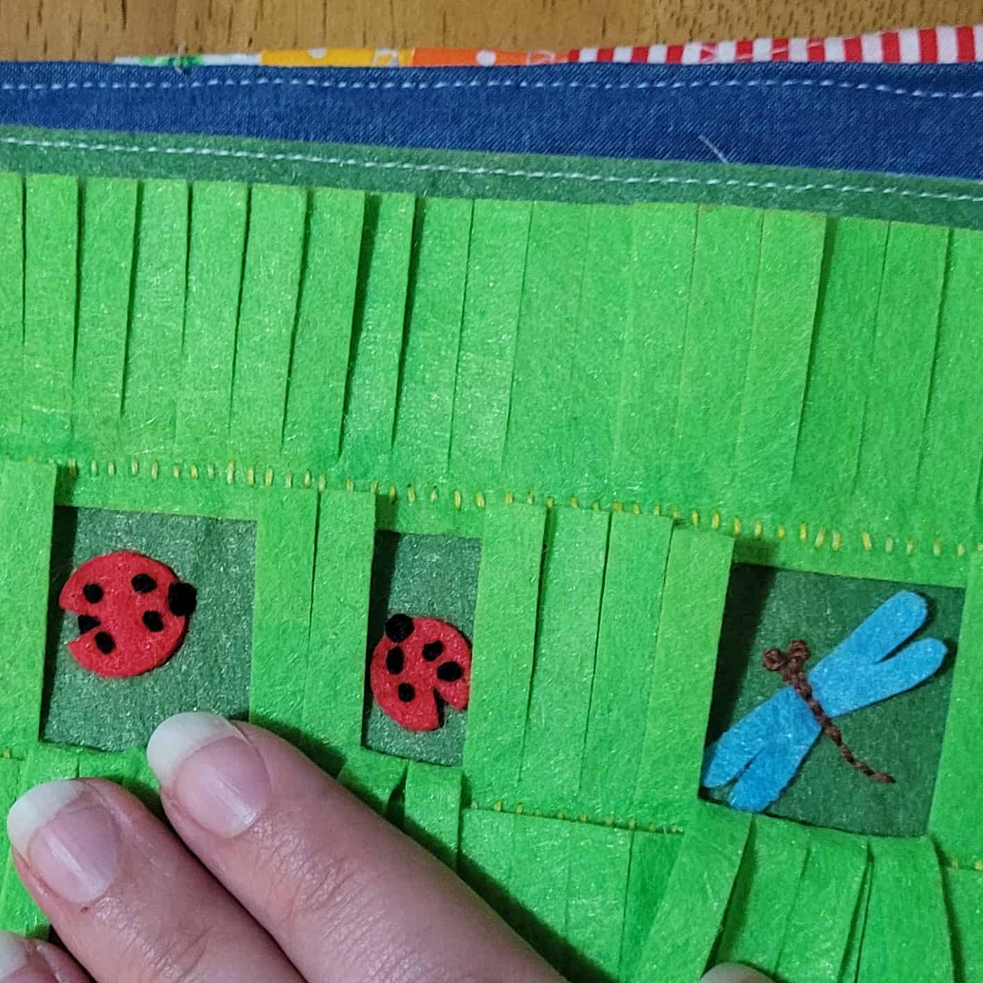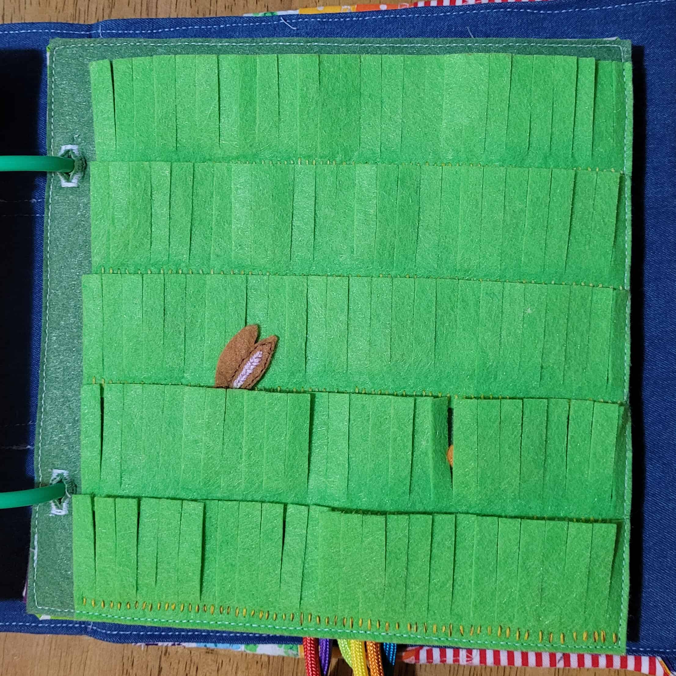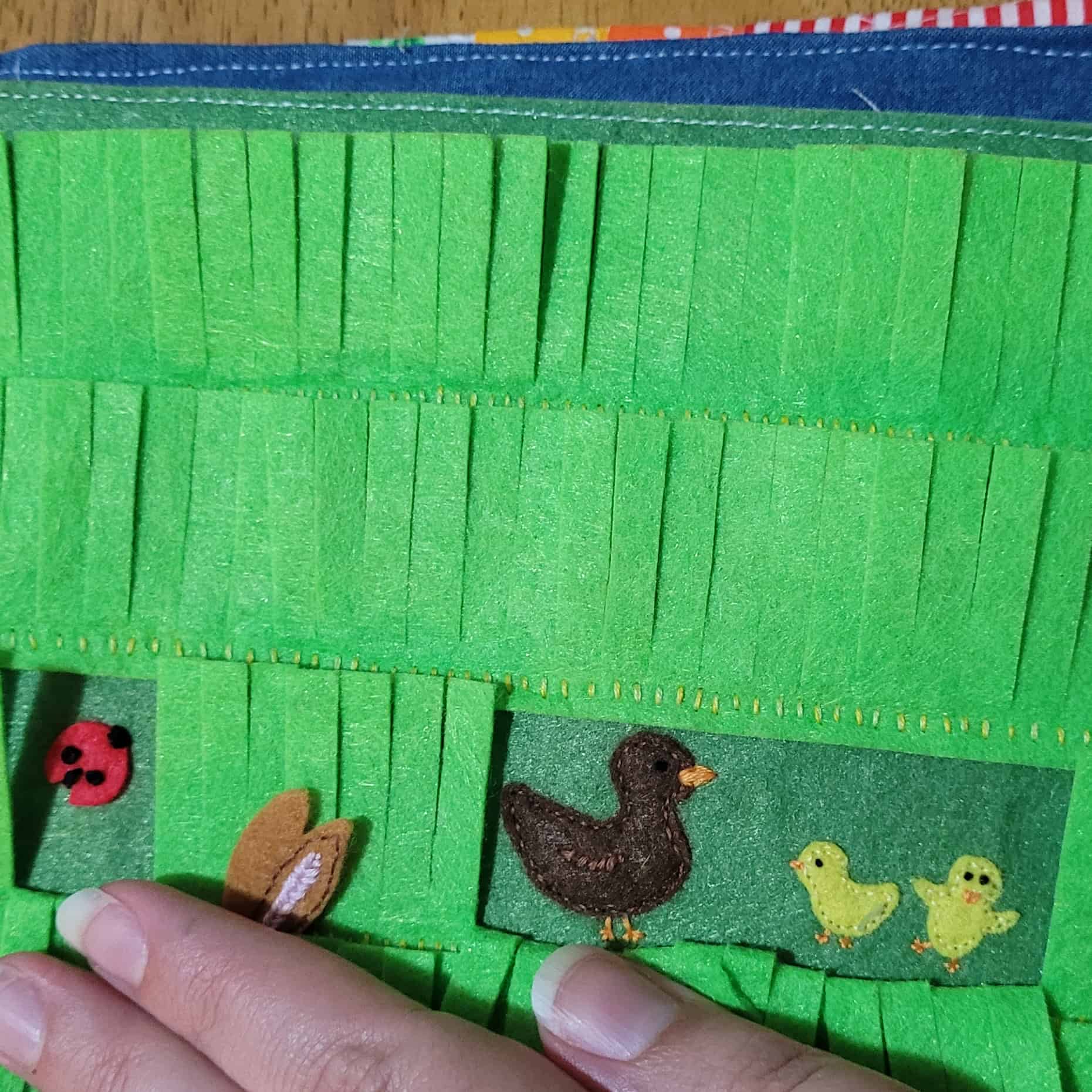 I needed more than one photo to show the fourth busy book page I made. This one has lots of little hand-sewn felt critters hidden in the strips of felt grass. I’m especially proud of the little ducklings. They were so tiny, so fiddly, but they turned out so cute!