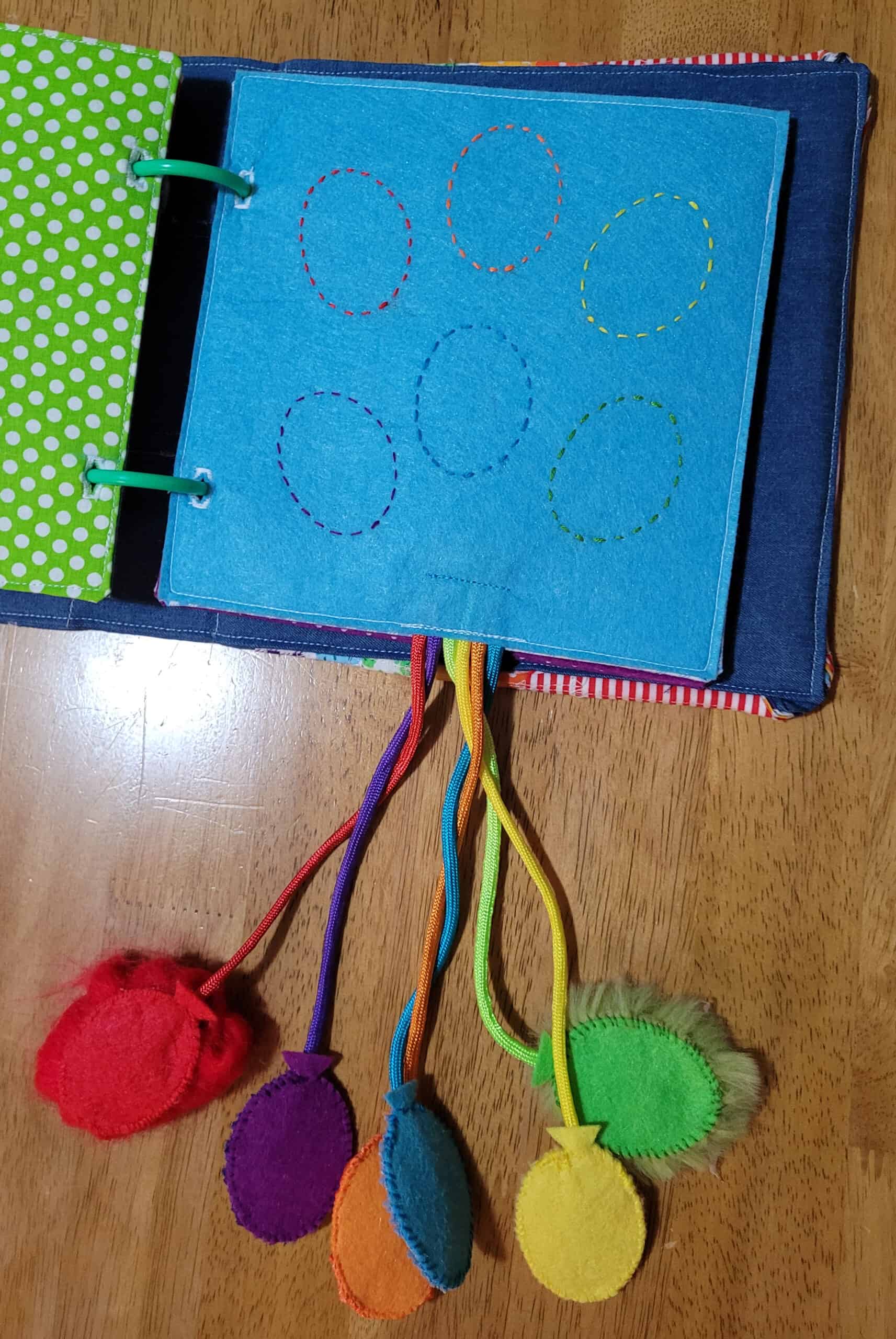 This is the fifth page in the original busy book. It’s a simple colour matching game with balloon shaped felt shapes on paracord strings.